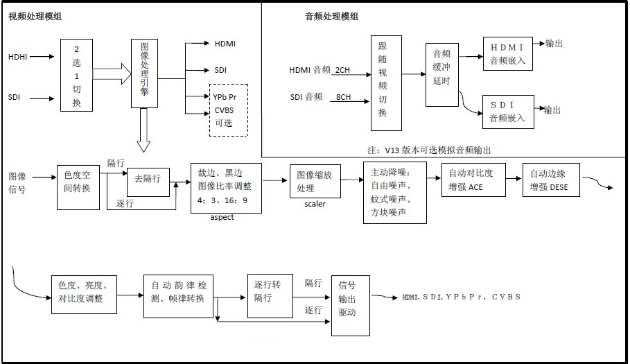 1、支持最高3G-SDI 或HDMI 數(shù)字視頻多格式信號,輸入3G-SDI 或HDMI 信號,輸出高達3G-SDI 或者4K-HDMI 視頻信號,各信號格式之間任意互換; 2、HDMI/DVI master 視頻整理功能,客戶很容易將電腦的屏幕素材直接轉換為任意的SDI播出信號,輸出信號可以選擇內鎖相方式或者跟隨輸入信號的時鐘,轉換后的SDI 信號各項技術指標符合廣電一級標準; 3、多種格式下變換(高清到標清),多種格式上變換(標清到高清),交叉變換(各種高清格式之間相互變換,例如:1080p 30 到1080p 60); 4、對疊加了椒鹽噪聲,隨機噪聲或者編解碼后的方塊噪聲有一定程度的降噪作用,在編碼器前端加入轉換盒處理后,可以有效提高后端編碼器的編碼質量和效率; 5、高標清變換器用于轉換任意格式的高清或標清輸入信號到多種格式的輸出信號,廣泛應用于各個領域。非常適用于前端到非線性編輯或作為視頻轉換或變換工具; 6、信號變換器支持16Bit精確度,128位價FIR濾鏡,13級水平濾鏡和9級垂直濾鏡,N制P制互轉; 7、支持I隔行制式信號到P逐行信號之間轉換,可以將隔行信號進行優(yōu)越的去隔行處理,輸入到電腦進行各項非編后期制作; 8、上下變換器支持全景,14:9,pillar/letter 和cut 4 種轉換模式;是個名副其實的百變轉換盒; 9、最高HDMI 輸出分辨率達到3840x2160 像素點,帶編碼開關調節(jié)輸出信號格式; 10、該處理器有V1 和V2 兩個版本,V2 版本集成了YPbPr 高清晰度視頻模擬分量輸出接口和標清(下變換)模擬CVBS 接口(俗稱AV 輸出),YPbPr 輸出最高支持1080P60 分辨率,最低支持NTSC 的720x480i60 分辨率;同時CVBS 輸出支持PAL720x576i50 和720x480i60,非常適合電視臺高標清同播時使用; 11、數(shù)字視頻處理器以其優(yōu)秀的廣播級質量、圖像增強、圖像降噪,反交錯等功能,廣泛應用于專業(yè)視頻應用領域;