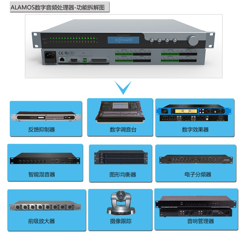 AL-1608采用ARM-AM5K2Ex為主控處理器,4片32比特SM320C6727B數(shù)碼處理器作為中心處理,并采用浮點(diǎn)設(shè)計(jì),這一設(shè)計(jì)可大大提升動態(tài)范圍,比24比特的設(shè)計(jì)質(zhì)量高出很多倍。具有壓縮、陷波濾波、自動增益控制、先進(jìn)的反饋抑制(AFS)、噪聲門和消除咝咝聲(De-Essing)全功能矩陣混音功能,為用戶提供天籟之音。