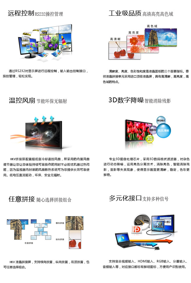 5、拼接方式多樣,支持橫屏拼接,也支持豎屏拼接,多信號(hào)分屏顯示,整屏顯示,任意組合顯示